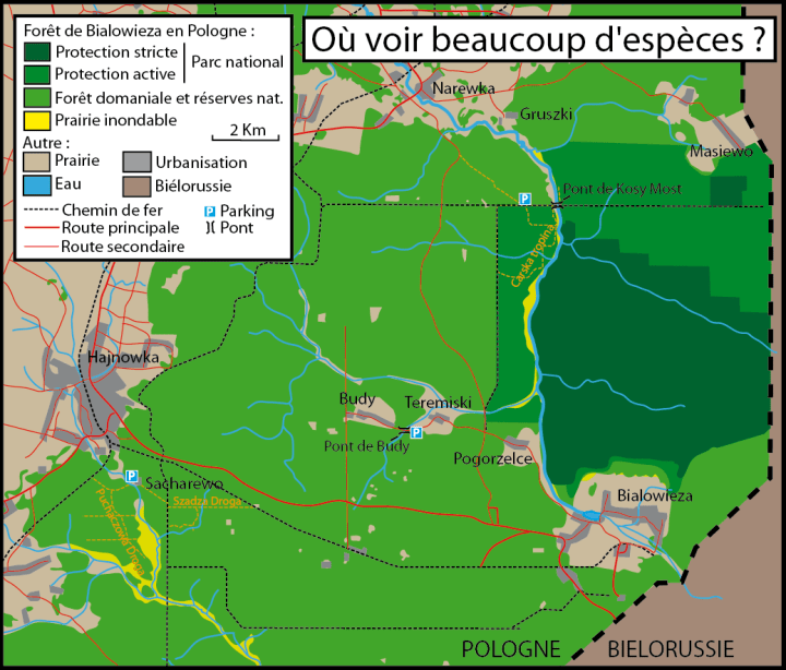 – le pont de Narewka juste au Sud du village de Bialowieza en marchant 500 m vers le sud et autant vers le Nord.