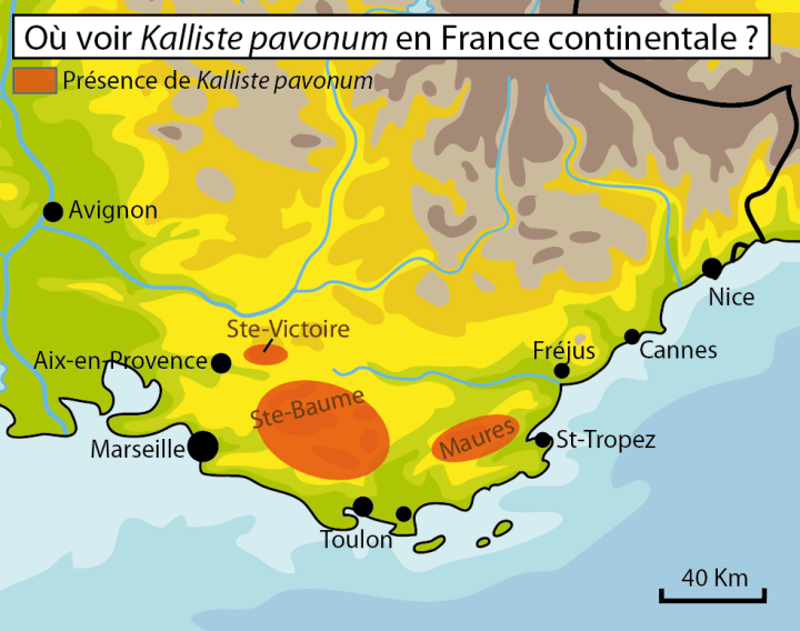 – le Var : elles sont dans l’Est du massif de la Sainte-Baume et dans le massif des Maures, donc au Nord et au Nord-Est de Toulon. Ces données sont situées entre 140 m d’altitude en zone urbaine (Les Faraches) et 700 m vers Notre-Dame des Anges au Nord de la ville de Collobrière.