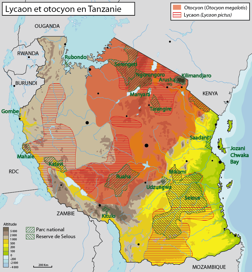 1 – Selous : 800 lycaons (2020) sont présents dans cette zone. Ils sont souvent observés autour de Mwanamungu et dans la zone entre le lac Mzizimia et le lac Manze. Ils sont plus vus entre juin et août et entre janvier et mars.