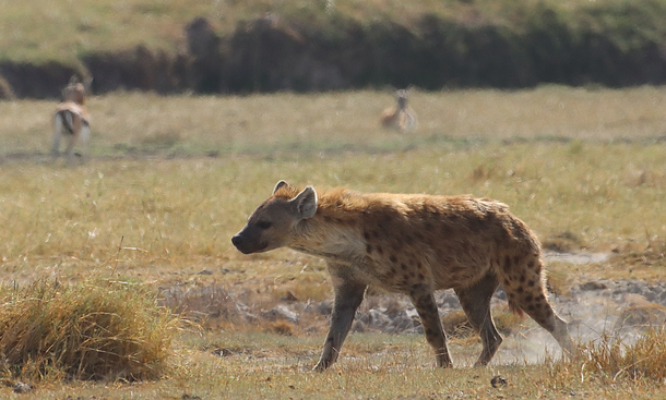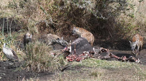 Ci-dessus : Hyène tachetée en attente du repas dans le cratère du Ngorongoro. Elle n’est pas loin d’un loup doré et d’un groupe de lion.