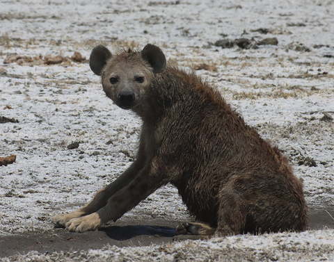 Ci-contre : Hyène tacheté dans la boue du lac du cratère du Ngorongoro.
