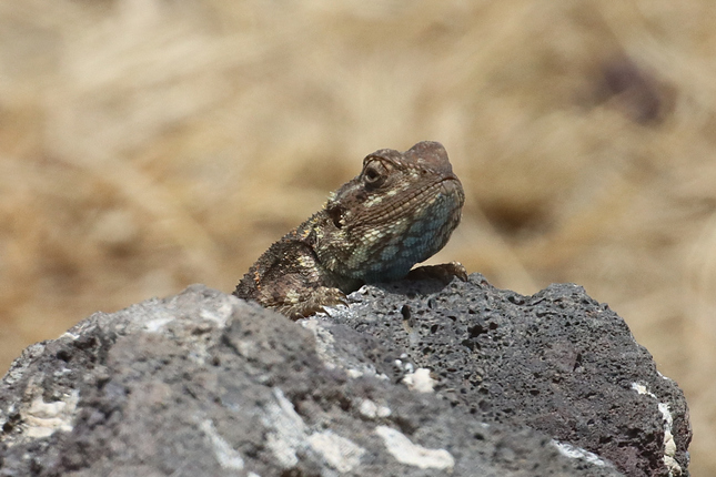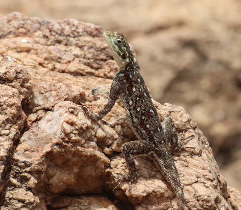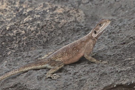 La femelle (photo ci-contre), est plus difficile à déterminer. Les spécialistes eux mêmes ont parfois de grosses difficultés de détermination avec certains agames. Aussi, si vous voyez une femelle, regardez les rochers aux alentours, ceux qui sont plus hauts et au Soleil. Le mâle dominant s’y trouve sans doute.