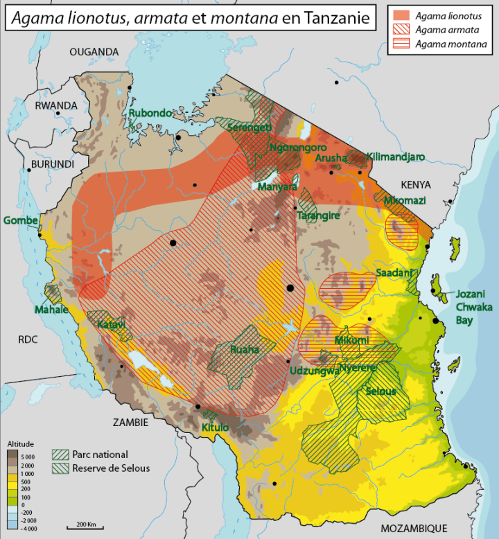 L’agame lionotus est l’agame le plus observé au Kenya. En Tanzanie, il est présent de 0 à 2500 m mais les densités sont plus importantes sous 1 500 m. Sa carte de répartition est présentée plus bas dans l’article.