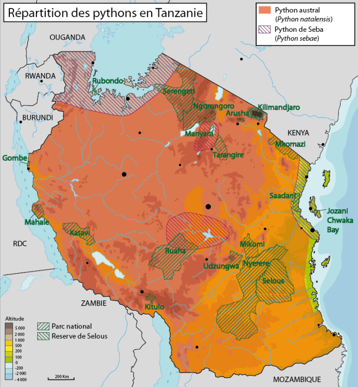 – le python de Seba est beaucoup plus localisé que le python austral en Tanzanie (voir la carte) ; Normalement, il n’y a que dans le secteur du lac Manyara et dans la partie Nord de Ruaha NP (jusqu’au Sud de Dodoma) que les deux espèces cohexistent.
